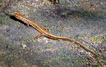 Long-tailed salamanders have a slender body and can grow to a length of 7.4 inches as an adult. As the common name suggests, the species has a long tail which makes up more than half of its total length. The base color of the head, back and tail is yellow to yellowish orange. The sides and back have black or dark brown, irregularly shaped spots. The sides of the tail have dark colored vertical bars that create a “herringbone” appearance. This salamander has 13 to 14 costal grooves running along the sides of the body.