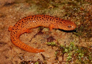 This large, stout salamander reaches a maximum total length of 18 cm. The back is a bright orange-red color with numerous bold black spots; underside is usually pink and unmarked. With age, individuals turn purplish and spots enlarge, becoming less defined. This species is often confused with the Mud Salamander (Pseudotriton montanus), as these species look similar and co-exist throughout much of their ranges. However, Red Salamanders generally differ in having more spots, golden irises, and a dark horizontal bar through the eye. Larval Red Salamanders tend to have less pronounced gills than larval Mud Salamanders.