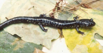 The Northern Slimy Salamander is a medium to large, woodland salamander about 4-7.5 inches long. Like other salamanders of the complex, the Northern Slimy Salamander is black to bluish-black. Individuals have numerous, large, white -brassy spots on the back and tail. They are moderately spotted on their sides. The degree of spotting and flecking varies among individuals. The Northern Slimy Salamander generally has white spotting on the chin and throat with a uniformly dark belly.