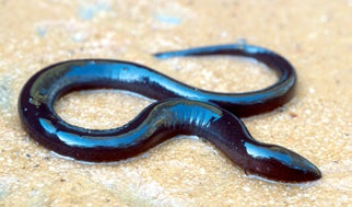 An elongate (up to 30 cm [12 in.] long), slender salamander, slightly more than width of a pencil in diameter. Unique among salamanders in possessing tiny, single-toed legs, one pair just behind the small gill opening at each side of neck and another pair just ahead of the longitudinal anal slit (Neill 1964a, Means 1996).Coloration uniformly dark brown dorsally and ventrally. Tail length about 22 percent of total length. Existence of larval stage unknown. Eggs and hatchlings undescribed. One of three species constituting an entire family whose fossil history extends back into the Cretaceous (more than 65 million years ago).