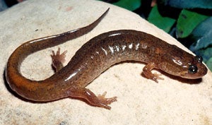 A moderate-sized, four-legged salamander averaging 1.2-2.4 inches in length, with individuals up to 5 inches in length described in the literature. The tail is moderately keeled.Individual populations (and even individuals within a single population) of Spotted Dusky Salamanders are remarkably variable with respect to markings and coloration, making a reliable description based on these characters nearly impossible. In most individuals, however, the back ranges from light tan to dark brown, with the belly typically cream-colored and variably marked with dark mottling. One of the most characteristic attributes of Spotted Dusky Salamanders is that coloration between the back and belly grade into one another gradually, versus the sharp transition seen in the Seal Salamander (Desmognathus monticola), a species with which the Spotted Dusky Salamander is often confused. Back markings are incredibly variable, ranging from no markings whatsoever to alternating pairs of six to seven spots that may be round, square, or irregular in shape. Coloration also varies with age, as older individuals are typically darker and less strongly patterned than younger ones. Larvae are characterized by an alternating pattern of six to seven pairs of spots running down the length of the back.