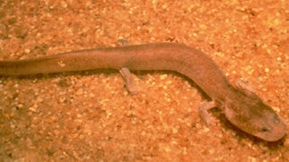 A neotenic, stygobitic salamander attaining a maximum total length of 15.5 centimeters (approx. six inches). Normally with gills throughout life; gills bright red and bushy or reduced; eyes depressed and greatly reduced in size; head long, snout spathulate; lateral line well developed with noticeable unpigmented sensory pores; tail laterally compressed with a well-developed caudal fin. Pigmentation variable, overall coloration salmon to pale flesh-pink; back may be faintly washed with brown; belly immaculate. Metamorphosed individuals in wild extremely rare and short lived, but are produced easily in laboratory. In such, gills are resorbed as is caudal fin. Color of back becomes faint yellow with irregular but distinct brown markings. Head extremely flattened and gular region greatly depressed. Eyes become enlarged, well pigmented, and protuberant, differing sharply from those of neotenes. Alabama populations predominantly of subspecies G. p. palleucus, with evidence of G. p. necturoides in populations along the western edge of Cumberland Plateau (McCrady 1954; Brandon 1965, 1967; Simmons 1975, 1976; Petranka 1998).