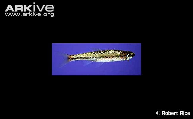 CHARACTERISTICS: One of the smallest shiners in North America, reaching only 45 mm [1.8 in.] TL, with slender body, long and slender caudle peduncle, very large eye, distinct lateral stripe around snout and to base of caudal fin with a light stripe just above lateral stripe, basicaudal spot either absent or chevron-shaped, and mouth distinctly upturned (almost vertical) and bowed forward. Floor of mouth darkly pigmented. Fins falcate and pointed, anal fin long (typically 10-11 rays), caudal fin deeply forked, pored lateral-line scales typically 2-5, pharyngeal teeth 0,4-4-0 with the posterior three teeth on each arch serrated, long and numerous (15-18) gill rakers (Bortone 1989, Suttkus and Bailey 1990). Nuptial males with tubercles on dorsal surface of first six pectoral-fin rays, pelvic fins longer than females reaching beyond anal fin origin (Suttkus and Bailey 1990, O’Connell et al. 1998). Specimens from two populations (Alabama/Mississippi and Florida) show only slight morphological differences, but phylogenetic analyses of mitochondrial DNA reveal that these two populations are genetically divergent.