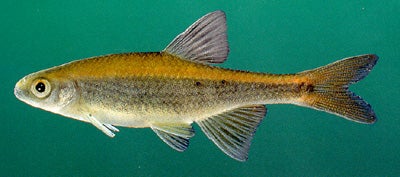 CHARACTERISTICS: The body of the broadstripe shiner is laterally compressed and deepest at the origin of the dorsal fin. Its head is small and somewhat triangular, with a blunt snout and a small, oblique mouth. A broad, dark lateral band extends from the tip of the snout to the base of the caudal fin. The lips and chin are dark. Breeding individuals have a bright orange caudal fin, as reported by Suttkus (1995). The lateral band is bluish gray and bordered above by a narrow orange stripe. The anterior tip of the dorsal fin is bright yellow-green, while the venter and lower flanks are pale. A clear "window" in the center of the caudal fin of large individuals is a distinguishing character and is not found in the similar sailfin shiner, Pteronotropis hypselopterus. Also, in breeding males of P. euryzonus, the outer margin of the extended dorsal fin is convex, with the anterior rays of the depressed dorsal fin equal to or slightly longer than the posterior rays. In P. hypelopterus this margin is concave or straight, with the anterior rays shorter than the posterior rays.
