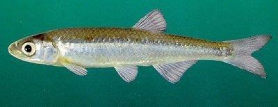 CHARACTERISTICS: The highland shiner is a slender, terete species with a pointed snout. The dusky lateral band extends from the gill opening to the caudal fin, expanding to form a distinct, quadrate caudal spot. The anterior lateral line scales are bounded above and below by weakly developed pigment spots. The lips are dark, but the chin is typically unpigmented. In life, Notropis micropteryx has an olive back with silvery sides and a narrow emerald stripe similar to that of the emerald shiner, N. athernoides, which the highland shiner also resembles in body form. The two can be distinguished by the anal fin margin, which is straight in micropteryx and concave in atherinoides. Breeding male highland shiners acquire a red flush throughout the body and on the snout, lips, chin, and top of the head. The highland shiner was split out from the rosyface shiner, N. rubellus, species group by Wood et al. in 2002. The rosyface shiner is not found in Alabama.