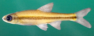 CHARACTERISTICS: This small species of Notropis has a deep, compressed body and a dark, pronounced lateral band extending from the tail to the snout. The inside of the mouth is intensely pigmented, a feature the separates this species from the weed shiner, N. texanus; coastal shiner, N. petersoni; and bluenose shiner, Pteronotropis welaka. Breeding males have a bright orange stripe above the lateral band, and the back is reddish brown with an olive cast. Orange "windows" appear above and below the caudal spot, with an orange cast extending onto the tail. Melanophores outline the anal rays.