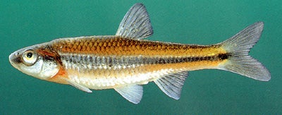 CHARACTERISTICS: The rough shiner has a deep, stocky, somewhat compressed body and a terminal, oblique mouth. Breeding males have a slight hump along the back between the dorsal fin and the back of the head. The lateral band is black with a yellowish cast. Above the lateral band, the sides are reddish brown with a slight yellow tint. Below the lateral band, they are yellow grading to a silvery white venter. All fins are yellow. Red and yellow variants of this species are known, the yellow form occurring in the western Mobile basin and the red form in eastern portions of that basin. See Suttkus and Raney (1955b) for original description.