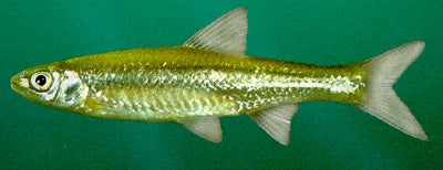 CHARACTERISTICS: This slender species has a compressed body and an eye diameter that is about equal to the length of the pointed snout. The lateral stripe, lightly outlined above and below with melanophores anterior to the dorsal fin, is darkest on the peduncle and fades toward the head. This species is sometimes confused with the sympatric emerald shiner, Notropis atherinoides, and silverstripe shiner, N. stilbius, but it is distinguished from them by its lack of dark pigment on the mouth.