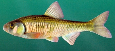 CHARACTERISTICS: The striped shiner has a deep head and compressed body. Its large scales are generally much higher than they are wide on the sides, and the pigment on some scales forms crescent-shaped bars. The back has distinct parallel bars running lengthwise and ending in a V at the caudal fin. Breeding males turn rose red color on the snout, lower head, and venter, while their sides become scarlet. Dorsal and caudal fins are flushed with yellow, and the paired fins and anal fin are pink to scarlet with clear margins. Individuals taken outside the breeding season have little color.