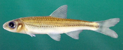 CHARACTERISTICS: The telescope shiner has a somewhat compressed body with large eyes that are longer than the short, pointed snout (though smaller than in the popeye shiner, Notropis ariommus). Viewed from above, the back has a dark predorsal stripe and two or three crooked, parallel stripes resulting from intense scale pigment. The lateral band extends along the entire body, becoming more intense on the peduncle and more diffuse toward the head. Lateral line scales are delicately outlined with melanophores above and below, while the venter is white. As mentioned above, N. telescopus is similar to N. ariommus, which has a larger eye, nine anal rays modally, no stripes on the back, and a weak predorsal stripe. See Gunther (1868) for description.