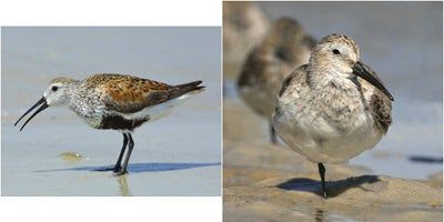 Dunlin are medium sized shorebirds between six and nine inches in length with a wingspan of about fifteen inches. The bill and legs are relatively long and black. The bill has a noticeable droop near its end. Birds have different breeding and nonbreeding plumages. In breeding plumage the dunlin is reddish-brown on its back and crown with dark streaking on the back and upperparts. Under parts are white but the belly has a distinct large black patch. In winter dunlins are nondescript grayish brown on top, whitish underneath but slightly darker on the chest. In winter the black belly patch is absent. In flight, a white wingbar is noticeable in all plumages. Sexes are similar.