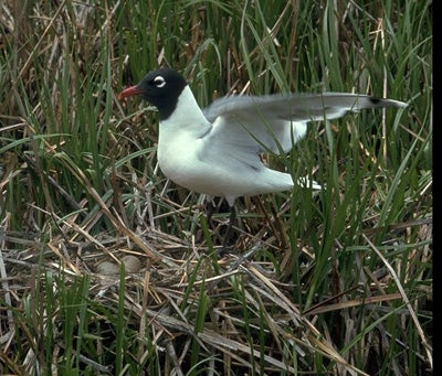Nesting occurs in large, noisy colonies. Floating nests are constructed of a variety of vegetation and are anchored to a platform of dead reeds. Nest material is continually added throughout the nesting period until fledging of the young occurs. Breeders will desert nests if disturbed. Breeding generally occurs from early May to early June. Both sexes share incubation responsibilities during an average incubation period of 18 to 20 days. The nestlings are semi-precocial and are tended by both adults. Franklin’s gulls may nest in association with other colonial nesters such as the black-crowned night-heron (Nycticorax nycticorax) and eared grebe (Podiceps nigricollis).