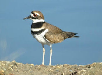 Killdeer (Charadrius vocifurus) are one of the best known American shorebirds. Sexes are outwardly alike and about the same size. They are 9 to 11 inches long with a wingspan of 19 to 21 inches. They are gray-brown above with white below distinguished by two black bands across the chest. The lower back, rump, and upper tail are an orange color and the legs and feet are flesh colored. They have a rounded tail with a black band close to the end that is tipped with white. Killdeer sport slim black bills and a white stripe along the wings. They are distinguished by their loud cry of kill-dee kill-deer or kill-deeah.
