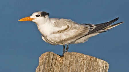 A large tern only exceeded in size by the Caspian tern. Adults are approximately 19 inches long with a wingspan of around 50 inches. Royal terns weigh from three-quarters to almost one pound. Breeding adults are white underneath with pale gray upperparts. Trailing edge of primary wing feathers is dark on the upper side. The head is topped with a black cap and crest. As the nesting season progresses, the forehead becomes more white and remains so through the non-breeding season. Royal terns have an orange bill and black legs. Immature birds retain a white forehead and have more brownish and darker wing feathers. The bill in young birds is more yellowish.