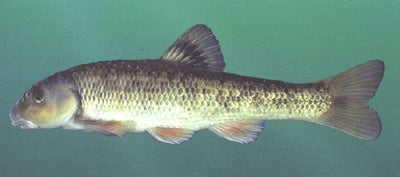 CHARACTERISTICS: Each of the species of the genus Campostoma has a cartilaginous ridge on the lower jaw and a greatly elongate intestine, which is usually more than twice the standard length. The largescale stoneroller is distinguished from the bluefin stoneroller, C. pauciradii, by having more gill rakers (usually 20 to 28) and more lateral line scales (usually 48 to 53) (Burr and Cashner, 1983). It also has fewer breeding tubercles on the head (10 to 22) than the bluefin stoneroller (23 to 27). The breeding male is brassy yellow along the back and upper sides, grading to white or light yellow along the venter. The dorsal, anal, pelvic, and pectoral fins are orange to pinkish orange, and the dorsal fin has a distinct black band.