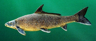 CHARACTERISTICS: The blue sucker has an elongate, cylindrical body, a short head, and a small mouth covered with many small papillae. The dorsal fin contains 29 to 37 soft rays, and its free edge is sickle-shaped. The caudal fin is large and deeply forked. The ventral fins are bowed downward, with lower edges that are often calloused from rubbing on submerged structures. Individuals are pale to dark blue, with brown mottling on the back shading to light gray on the venter. On spawning adults, body colors intensify, and the body, head, and even fins become covered with hundreds of small, white breeding tubercles. According to Richard L. Mayden and Brooks M. Burr, blue suckers in the Mobile basin may represent a new species. See Lesueur (1817b) for original description.