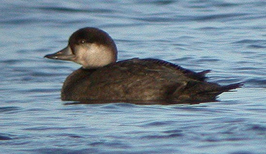 The black scoter is a mid-sized sea duck. The male is black in color except for a yellow protuberance at the base of its bill and gray lower surface of the flight feathers. Females and immature birds are black-brown except for the whitish coloration of the cheeks, chin and throat. The female and immature black scoters have coloration which resembles that of the female ruddy duck, but the scoter is nearly double its size. Like the ruddy, the scoter tail is sometimes elevated at a 45-degree angle. The tail of the black scoter is also longer than other scoters. The feet of both sexes are dusky and the eyes are brown. The eyes are different among the sexes of the other scoters. Male black scoters average just under 20 inches in length and average 2.5 pounds, while females average just under 19 inches in length and 2.2 pounds.