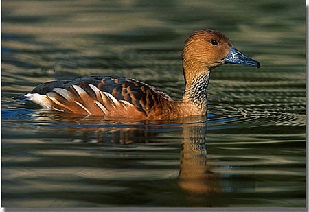 Looking more like a goose than duck, the males measure 17.7 to 18.5 inches with a weight of 1.1 to 1.9 lbs. Females measure 16.0 to 18.3 inches and a weight of 1.2 to 1.9 lbs. Both sexes have similar plumages, with the head, chest, breast and belly being a tawny-brown. The back is dark brown and the rump being white. The side and flank feathers have an ivory edge that forms a border between the sides and the back. A white V separates the brownish-black tail from the dark plumage of the back. The wings are brown-black with a russet brown patch on the shoulder. The bill, legs and feet are a blue-gray in color. During flight and feeding, they are very vocal.