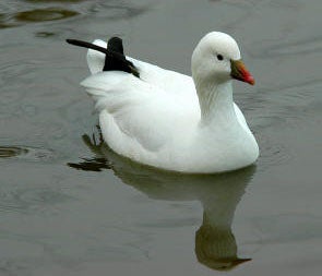 The Ross’s Goose is the smallest of the three varieties of white goose in North America. Males range from 24 to 26 inches in length and weigh an average of four pounds. Females are somewhat smaller, averaging 23 inches in length and an average weight of 3.5 pounds. The Ross’s goose has a short triangular shaped bill that is pink in color. Characteristically, the bill of this species does not exhibit the “black lips” or “grin patch” that are common in similar species, such as the Snow Goose. The adult Ross’s goose is entirely white in color, with black primaries and legs that are pink in color.