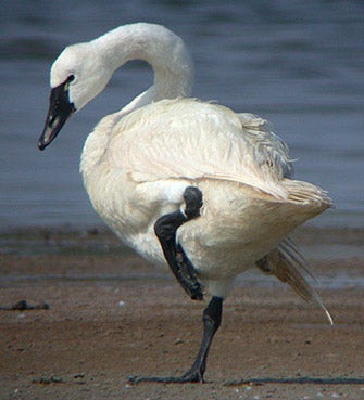 Tundra swans (Cygnus columbianus) are large birds with a long, extended neck that is equal in length to the body. Adults are white in color (body, neck and wings) with black wing tips. They have black bills with a yellow spot at the base; their legs and feet are also black. Immature birds are brownish gray. At rest, the neck is held straight or with a slight curve near the base. Adult tundra swans average just over four feet in length and weigh about 15 pounds.