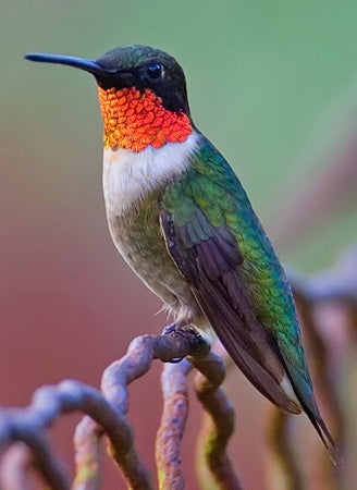 Archilochus colubris is 3 to 3 ¾ inches long with a wingspread of 4 to 4 ¾ inches. Both sexes are metallic green above and grayish underneath. Adult males have throat feathers that appear black but flash fiery red or orange in the sunlight. Males have a tail that is slightly forked. Females have white throat patches. Their tails are not forked and have white spots on the outer corners.