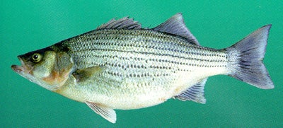 The palmetto bass, also called hybrid striped bass, is not a naturally occurring species. Individuals are produced by artificially spawning a male white bass with a female striped bass. Offspring usually exhibit a wide variety of color patterns which can be confusing when trying to separate them from the young of either parent species. A hybrid bass can usually be distinguished from a striped bass by its broken lateral stripes along the lower sides of the body (continuous on striped bass) and a distinctively shorter, thicker, and deeper body form. Hybrid bass can be distinguished from white bass by its two tooth patches on the tongue, as opposed to only one tooth patch on the white bass. As they grow older, hybrid bass become thicker and deeper-bodied, giving them a distinctive short and stocky appearance.