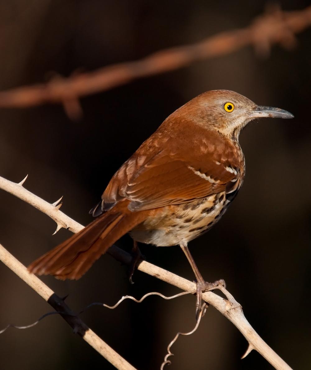 The brown thrasher is adapted to brushy habitats, brushy woods margins, and residential areas with shrubbery. It’s long rudder-like tail and short wings are adapted to maneuver within brushy cover.