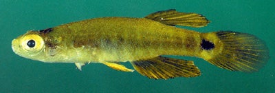 CHARACTERISTICS: Adult males of the pygmy killifish are generally uniform olive to yellow-olive, fading to light yellow or white on the venter. Five to seven wide but faint vertical bars mark the sides, being most conspicuous on the caudal peduncle and fading anteriorly. All median fins and the pelvic fins are yellow. A large black spot frequently haloed in creamy yellow is usually present at the caudal fin base. The dorsal and anal fins of breeding males are elongate and, when depressed, almost reach the caudal fin base. Females are slightly larger and have no vertical bars, shorter dorsal and anal fins, and a more intense lateral band. Females also have, in the middle of the lateral band, a large spot that is about the same size as the caudal spot. The body form is slender, and the mouth is small and upturned, presumably to facilitate feeding at the water’s surface. See Jordan (1884a) for original description.