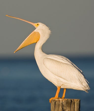 The American white pelican is a large white bird with black primary and secondary wing feathers. It can weigh as much as 30 pounds with a wingspan of eight to nine feet. In flight, it alternately soars and flaps with flocks flying in a V-formation with the neck bent and its head close to its body. It has a large yellow or orange bill with an extensible pouch, short legs, and webbed feet. Both sexes look alike and during the breeding season they develop a short yellowish crest on the back of their head and a horny ridge plate on the upper mandible.