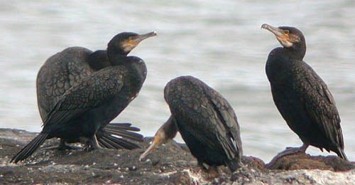 HABITAT: Great cormorants are most common in temperate regions. They are most frequently found associated with habitats providing permanent fairly deep water (in which they feed) bordered by trees for roosting. Suitable habitats include the open sea and estuaries as well as freshwater rivers and lakes. They are frequently seen perched in trees, their wings widespread, allowing their feathers to dry.