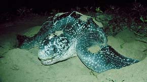 Well adapted to life in the open ocean. Known for its deep diving capabilities, which probably relates to foraging through the deep ocean water column. Dives of more than 1,000 meters (3,280 feet) have been recorded. Well known for traveling great distances, and movements of more than 5,000 kilometers (3,100 miles) have been reported, including travel into cold waters. Most nesting occurs on tropical beaches. However, a small number nest in Florida each year during the spring and summer. Leatherback nesting beaches normally have a steep slope, have high energy wave action, and are in close proximity to deep oceanic water. A typical female will nest five to seven times per nesting season with an average of 10 days between nestings. However, some have been recorded to nest 11 times in a single nesting season. A female normally nests every other year or every third year. Lays relatively large eggs compared with other sea turtles, but produces fewer eggs per nest (approx. 60 to 90 eggs per nest). Eggs take approximately 55 to 75 days to hatch; hatchlings emerge at night and travel down to the surf. Gender of hatchlings is determined by the incubation temperature of the egg. Hatchlings will swim offshore and take up a pelagic existence. Average age to sexual maturity has not been well documented. Primarily a water-column feeder (Ernst et al. 1994). Jellyfish are a main component of the diet, but also eat other items such as squid, crustaceans, and tunicates.