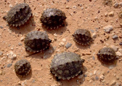 Several nesting observations have been conducted on Gravine Island which is located in the Mobile-Tensaw Delta in Baldwin County. At this site, nesting season begins in May and peaks from mid-June to mid-July and ends in early August lasting about 72 days. Nesting habitat is found on beaches near deep water. Clutch size ranges from three to seven eggs and incubation lasts close to 63 days. Three clutches may be produced annually. Nest depredation by fish crows has been reported to be as high as 82%. Captive wild black-knobbed sawback turtles have been known to live for 13 years.