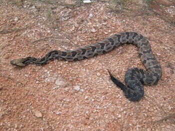 Timber rattlesnakes (Crotalus horridus) are heavy-bodied snakes with a broad head that is distinct from its narrow neck. Adult timber rattlesnakes average 36 to 60 inches in total length. The coloration of this species varies from blackish to yellowish to pinkish, or grayish with dark, bent crossbands aligned along the dorsal length of its body. On many specimens a reddish dorsal stripe runs between the crossbands. The velvety black tail is short and thick, tipped with a tan rattle. Some people refer to the timber rattlesnakes found in the southern Alabama as “canebrake rattlesnakes." The timber rattlesnakes found in northern Alabama are simply referred to as “timber rattlesnakes.”