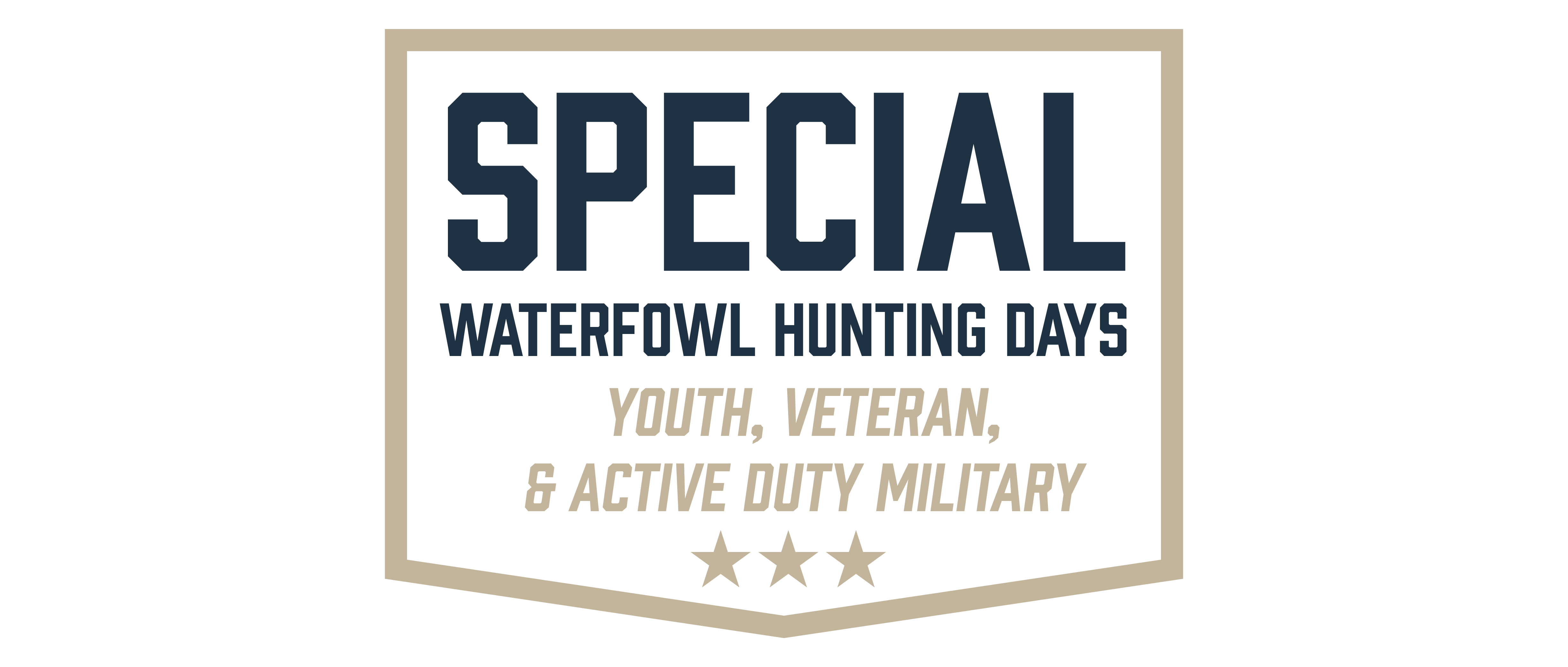 Special Youth, Veteran, & Active Military Personnel Waterfowl Hunting Days will be on November 23, 2024 and February 8, 2025. The regular waterfowl season shooting hours, bag limits, and legal arms and ammunitions apply to the special days. Individuals must follow the listed rules to participate in the scheduled youth, veteran, & active military personnel waterfowl hunts: