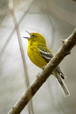 Breeds in open pine woods but will inhabit any trees or shrubs during migration. The pine warbler is a particular species of interest in many longleaf pine ecosystem restoration efforts.