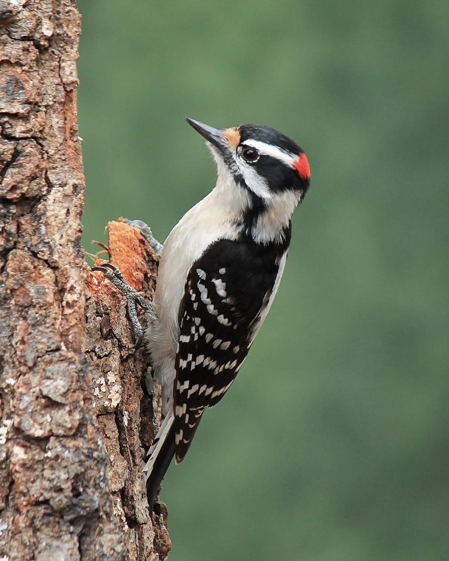 Downy woodpeckers (Picoides pubescens)are small birds, black and white in color having checkered and spotted patterns on their wings. They are one of only two species of woodpecker with a white back. Downy woopeckers have white bellies and small, black bills. Males have a small red patch on the back of their heads (females lack this characteristic). Downy woodpeckers are almost identical to hairy woodpeckers (Picoides villosus) in coloration and pattern. The only differences are the downy’s smaller size and smaller bill.