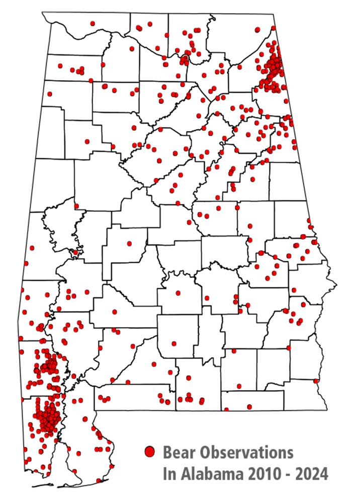Historically, Black Bears were found statewide, but as suitable habitat began to dwindle over the years, bear numbers declined drastically, leaving only small, isolated populations across only a handful of counties. As population levels became critically low, the black bear was listed as a state-protected species to help recover the species in Alabama.