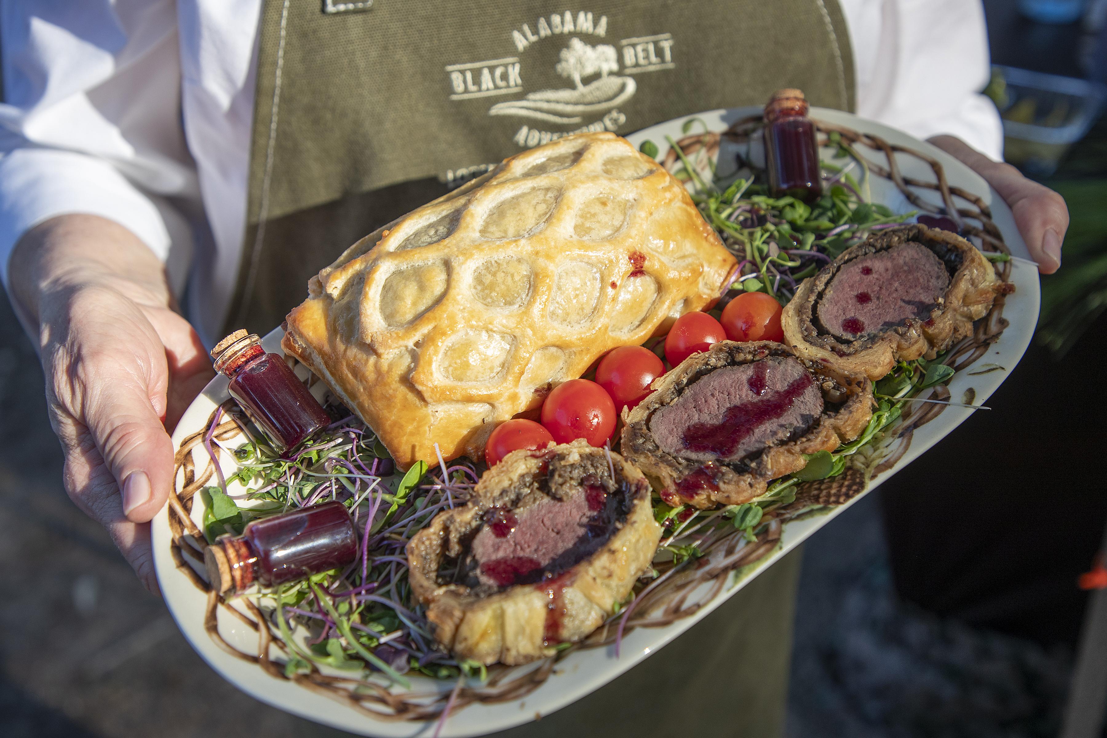 “We seared our venison with just salt and pepper and garlic in olive oil. Then we took phyllo dough and spread some sheets out. We spread our mushrooms on the phyllo and then spread some Dijon mustard on the venison. We wrapped it up really tight in the phyllo. We refrigerate it for about 20 minutes. Then we took our venison and put it in puff pastry, kind of like a Hot Pocket. We take one sheet of puff pastry and egg wash it. We take another sheet of puff pastry and do some lattice work for presentation and egg wash that. We cooked it (400 degrees) for about 20 minutes or until the venison hit about 125 degrees, medium rare. The puff pastry should be a nice, golden color. We added a red wine reduction, but you can use any sauce you want.”