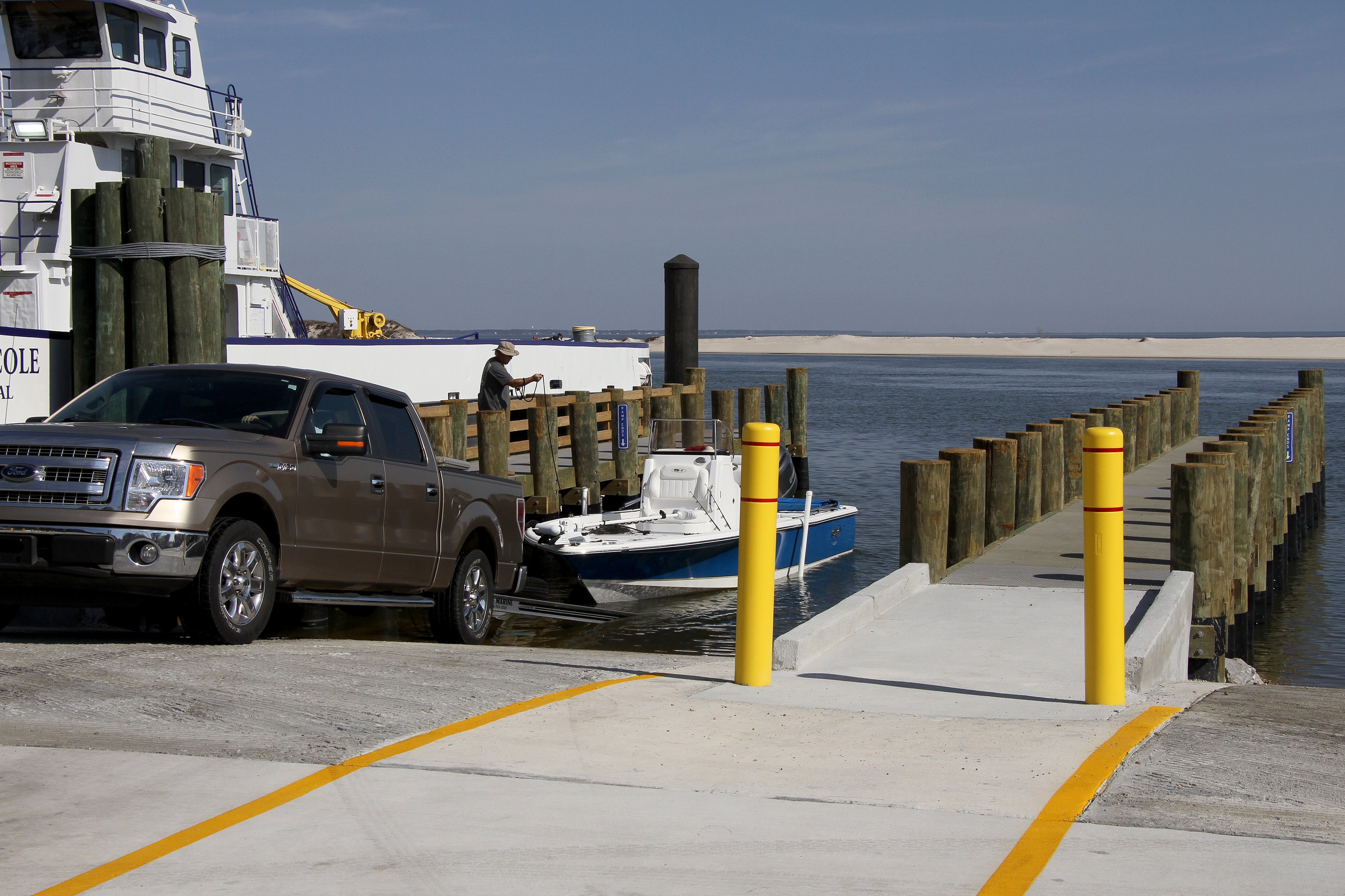 The ramp is bordered by the Mobile Bay Ferry dock on the west side and a marine service company on the east side, limiting the amount of space available to rebuild the ramp. The piers at the ramp are wider to be ADA compliant.