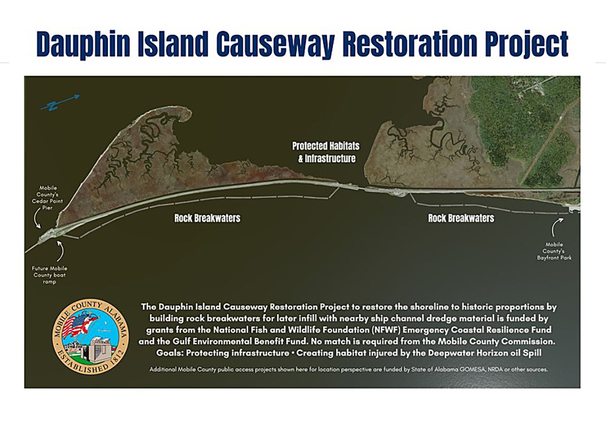 The Dauphin Island Causeway Shoreline Restoration Project is being done in three phases to enhance and protect the only access road from Dauphin Island to the Mobile County mainland.