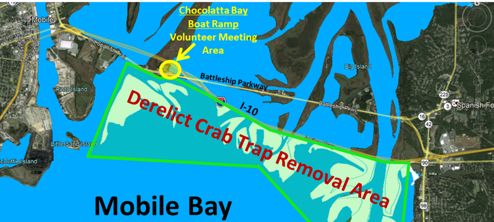 The Alabama Marine Resources Division (MRD) of the Alabama Department of Conservation and Natural Resources (ADCNR) invites the public to take part in a derelict crab trap cleanup in Mobile Bay on Friday, May 3, and Saturday, May 4, 2024. The derelict traps will be marked on Friday and removed on Saturday. There will be a post-event social at Meaher State Park in Spanish Fort on Saturday, May 4, at approximately 1 p.m.