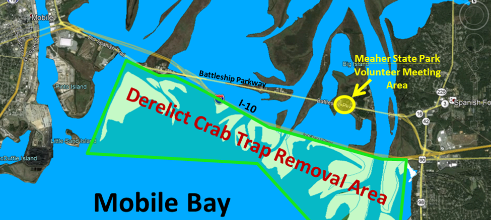 On Saturday, October 25, small shallow-draft powered vessels will be needed to collect and deliver the derelict crab traps to the disposal site located at Meaher State Park.
