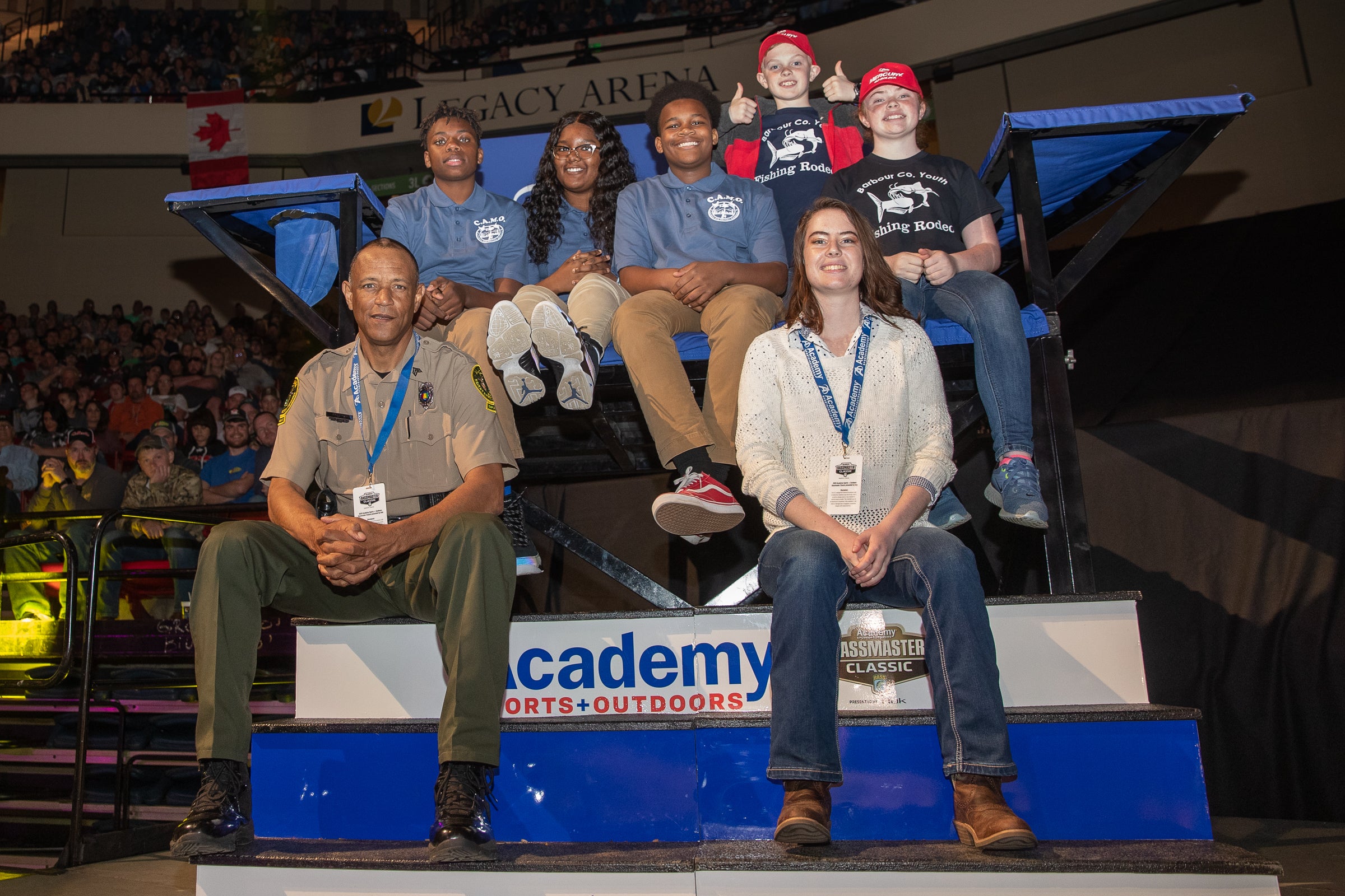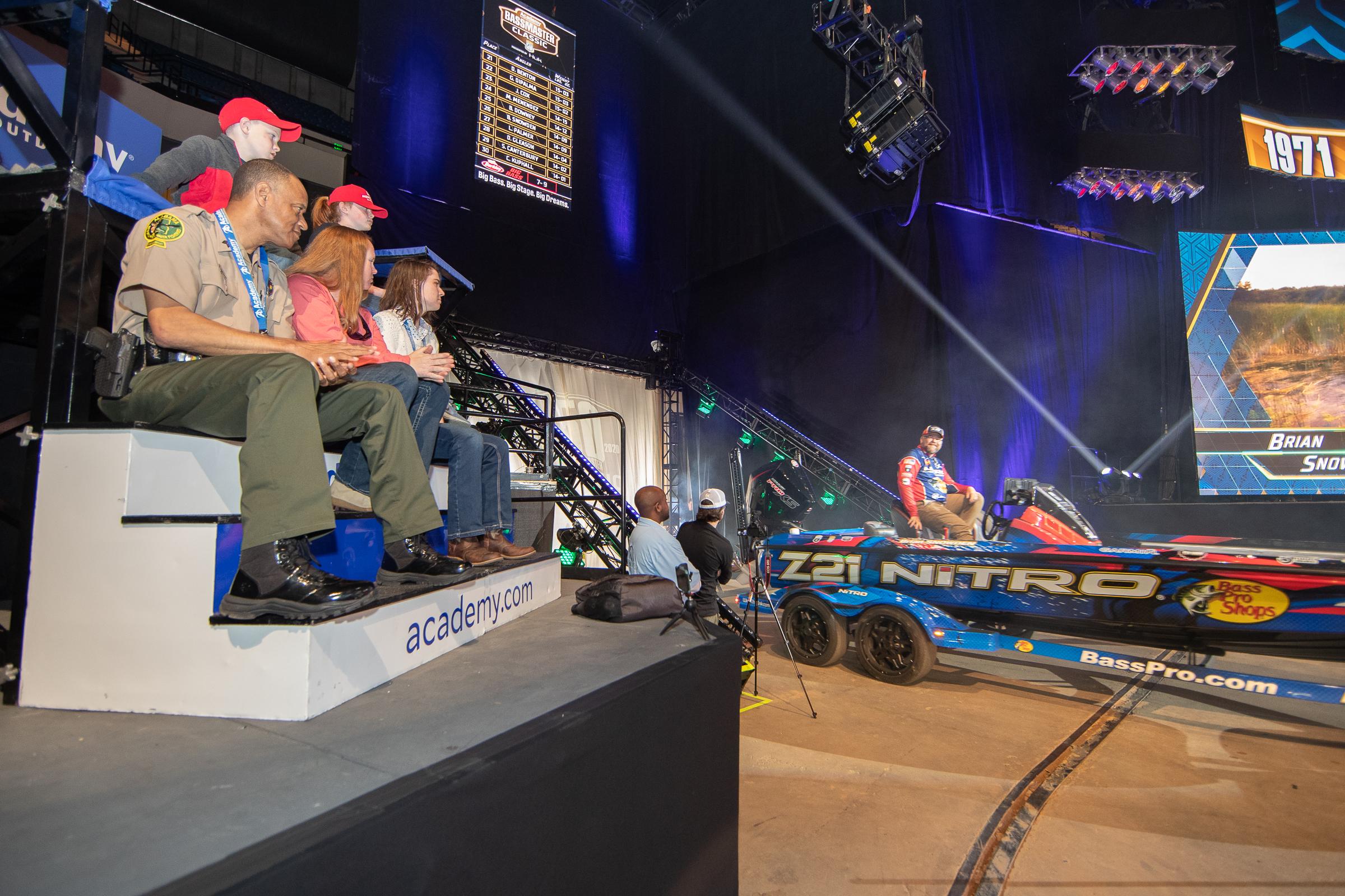 During Saturday’s weigh-in ceremonies at BJCC’s Legacy Arena, one of WFF’s conservation enforcement officers, Sergeant Bill Freeman, was spotlighted in an oversized Academy chair as the honored first responder.