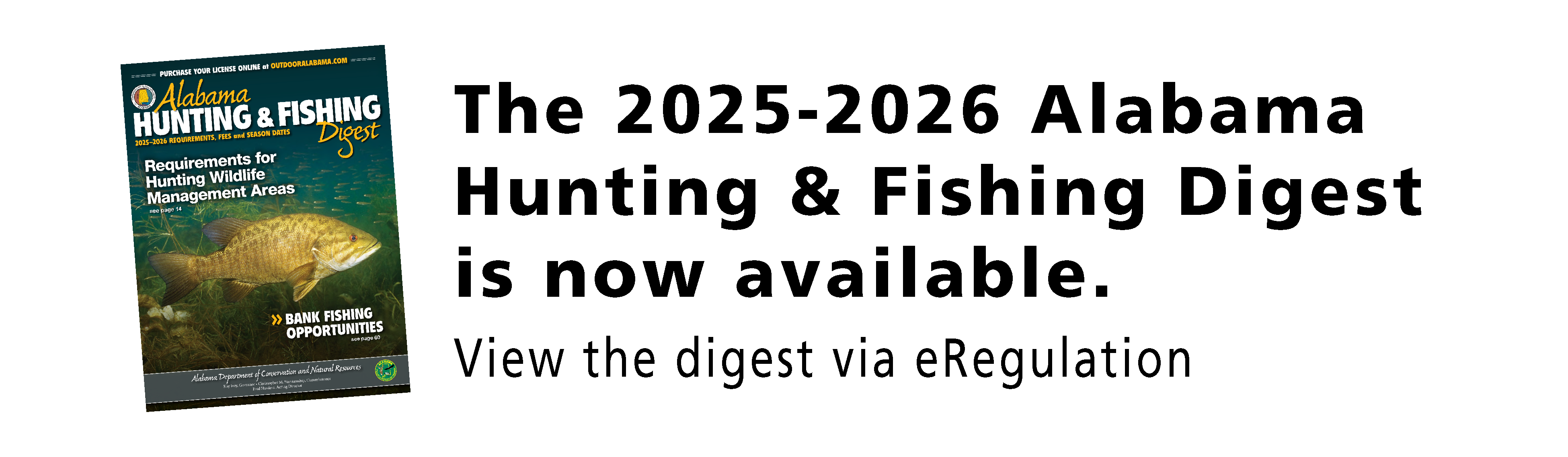 This information is also available in the 2025-2026 Alabama Hunting & Fishing Digest. To obtain a hard copy, visit your local probate office, license commissioner, or license agent. The digest is also available online.