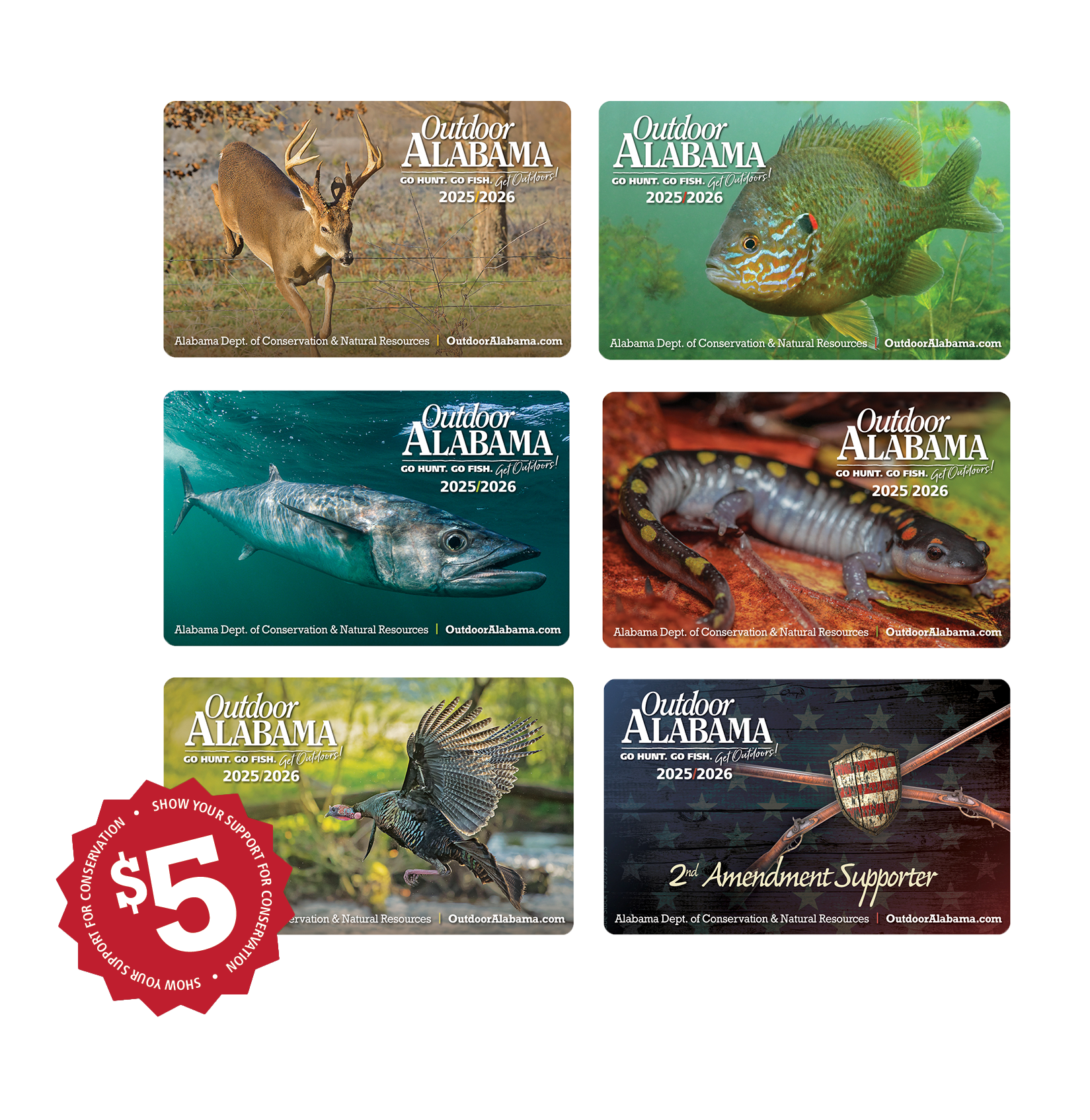 For an additional $5 to your license purchase, you can select from six new designs for the 2025-2026 license year that depict a variety of wildlife photography and outdoors-themed images. The wildlife designs include deer, turkey, freshwater/saltwater fishing, a Second Amendment card, and a watchable wildlife card featuring an American Black Bear Cub.