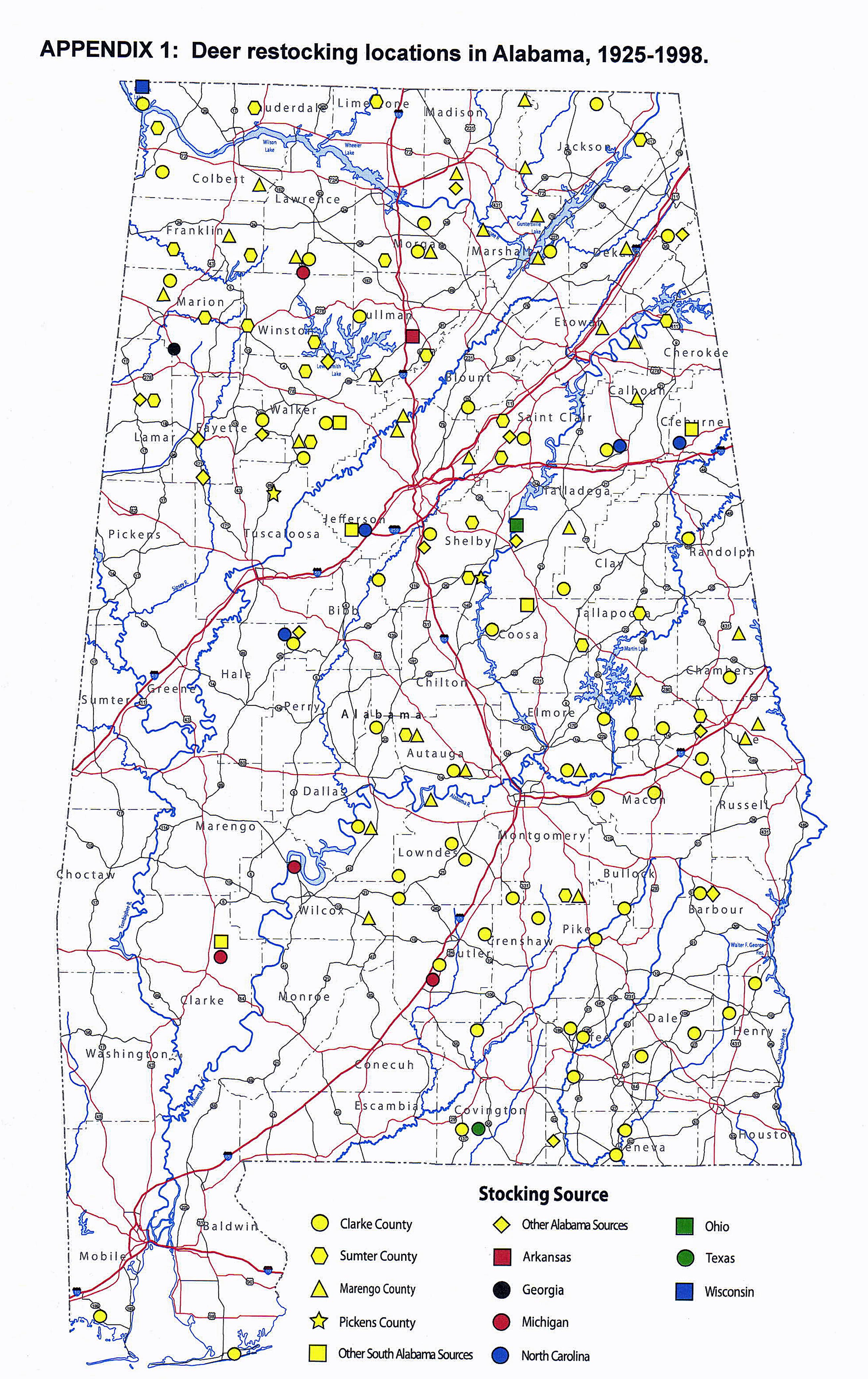 “There are several oddball areas. If you look on the map and check the (color-coded) dots, you’ll see where the deer came from. You’ll see deer from Wisconsin or Texas and where they were placed throughout the state. Even though it’s been 50 or 60 years ago, the rut still mirrors the basic genetics of that deer herd. So there are isolated pockets in Alabama, unlike any other place in the nation where I’ve worked, where you’ve got deer rutting in November, December, January and February. You’ve got months that, depending on where you are in the state, you can hunt the rut.
