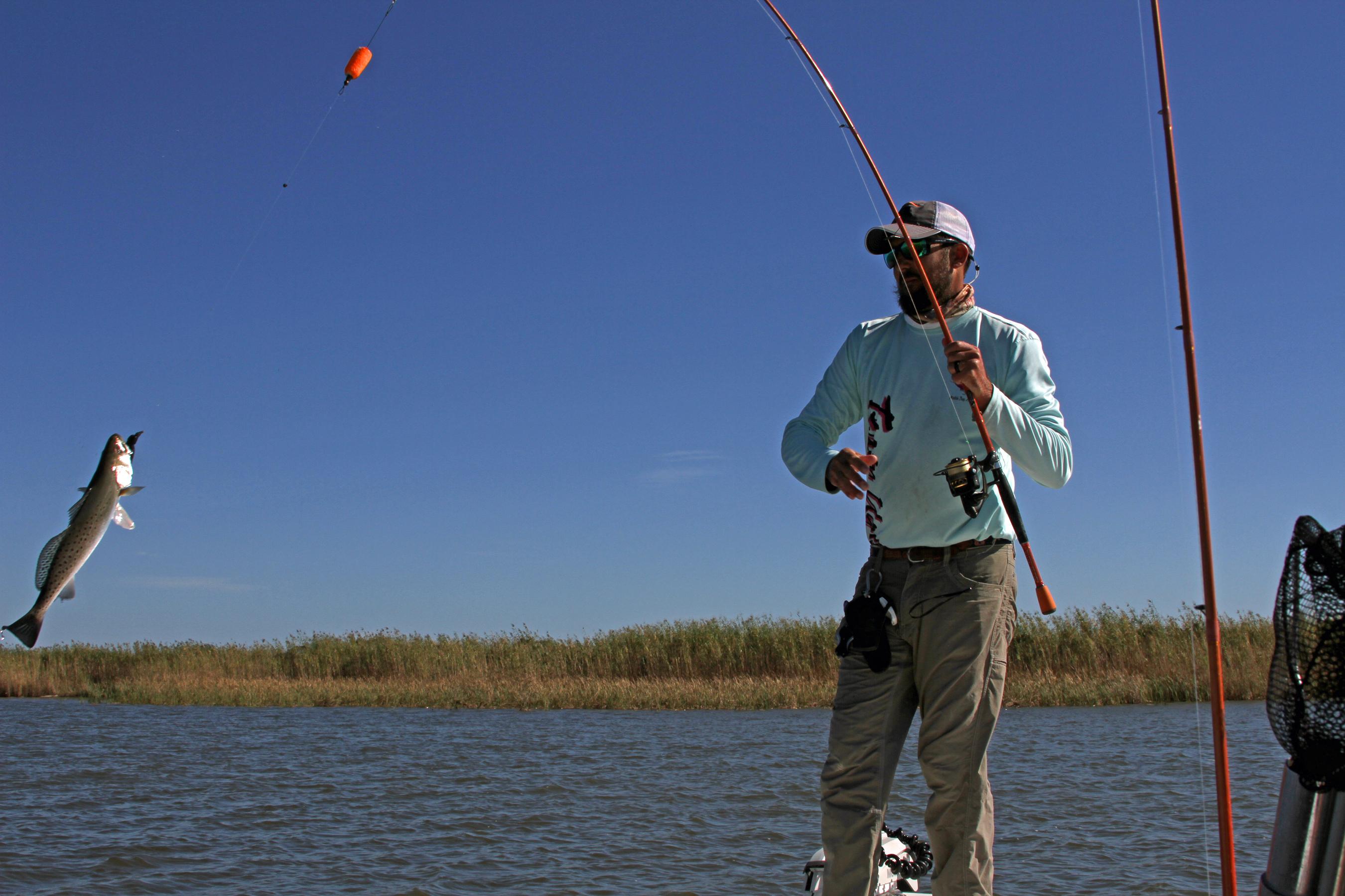 We threw grubs on lead-head jigs, tandem Road Runner rigs designed for crappie, and grubs a couple of feet under popping corks. While the jig-grub combination produced slightly larger fish, including a beautiful, 25-inch redfish, better numbers came on the jig under a popping cork, which produces a noise that sounds like trout feeding. The popping cork rig produced trout when the plain grub was ignored.