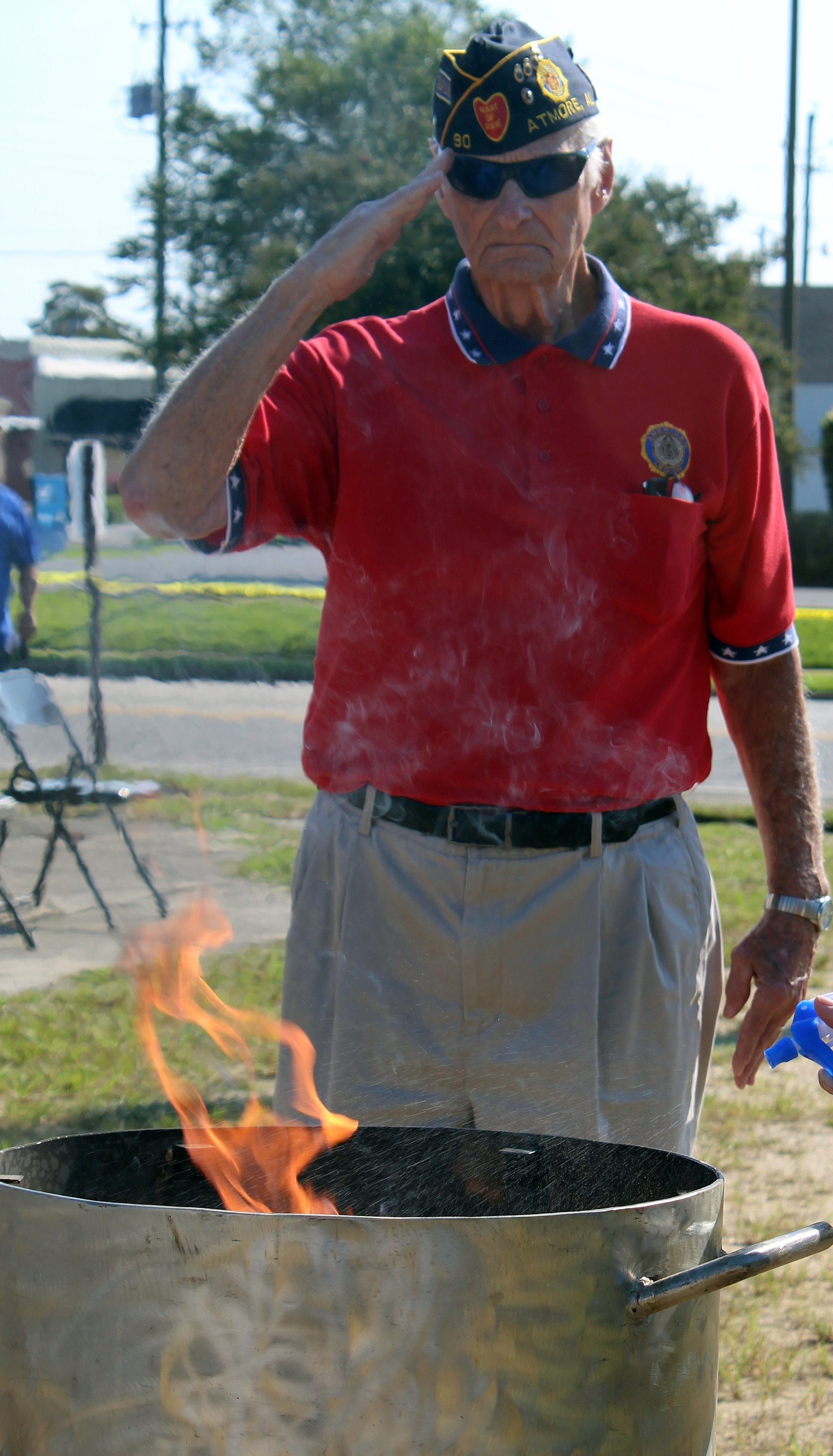 Legionnaire Jack Wright salutes during a 9/11 flag retirement ceremony in Atmore, Alabama. Photo courtesy of American Legion Post 90.