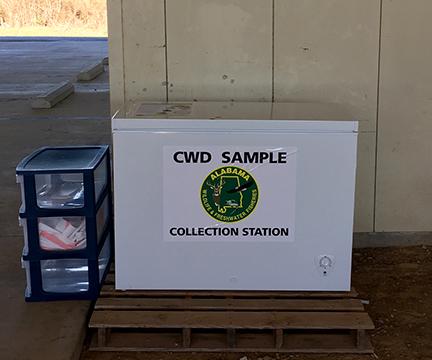 The Alabama Division of Wildlife and Freshwater Fisheries (WFF) has deployed self-service Chronic Wasting Disease (CWD) sampling stations in north Alabama as part of its increased CWD sampling surveillance efforts in the state. The sample station freezers are in Fayette, Lamar, Marion, Marshall, Franklin, Lauderdale, and Colbert counties, and are available to receive deer head samples 24 hours a day, seven days a week.