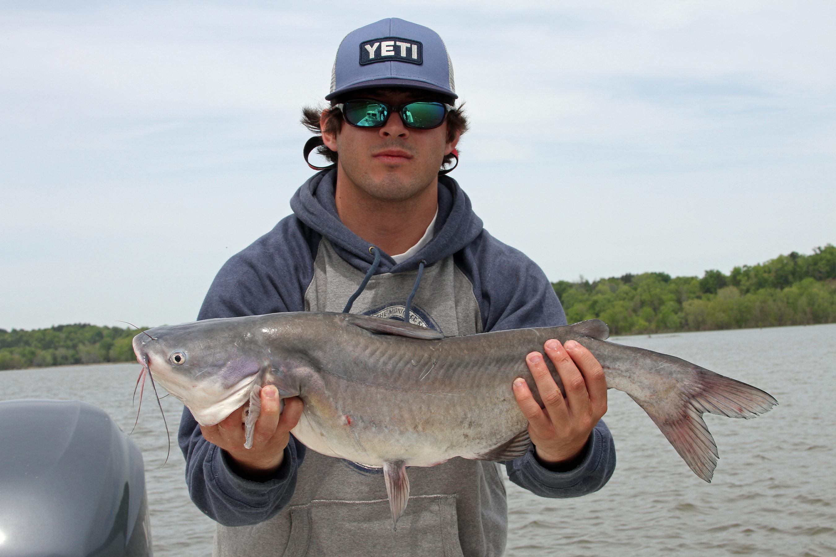 Back to the feeding frenzy we had last week, the blue cats (and occasional channel cat) were hungry. We baited the circle hooks and started tossing out jugs about 25 yards apart and let them drift down the flat. Within five minutes, the action was non-stop, and we worked Hayden non-stop. As soon as a fish was thrown in the live well, another jug would start bobbing.